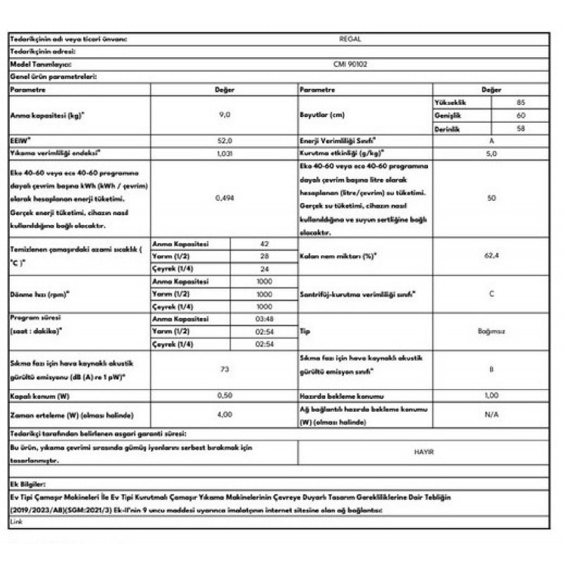 Maksimum Sıkma Aşamasında Ses Gücü Değeri Db(A) 73